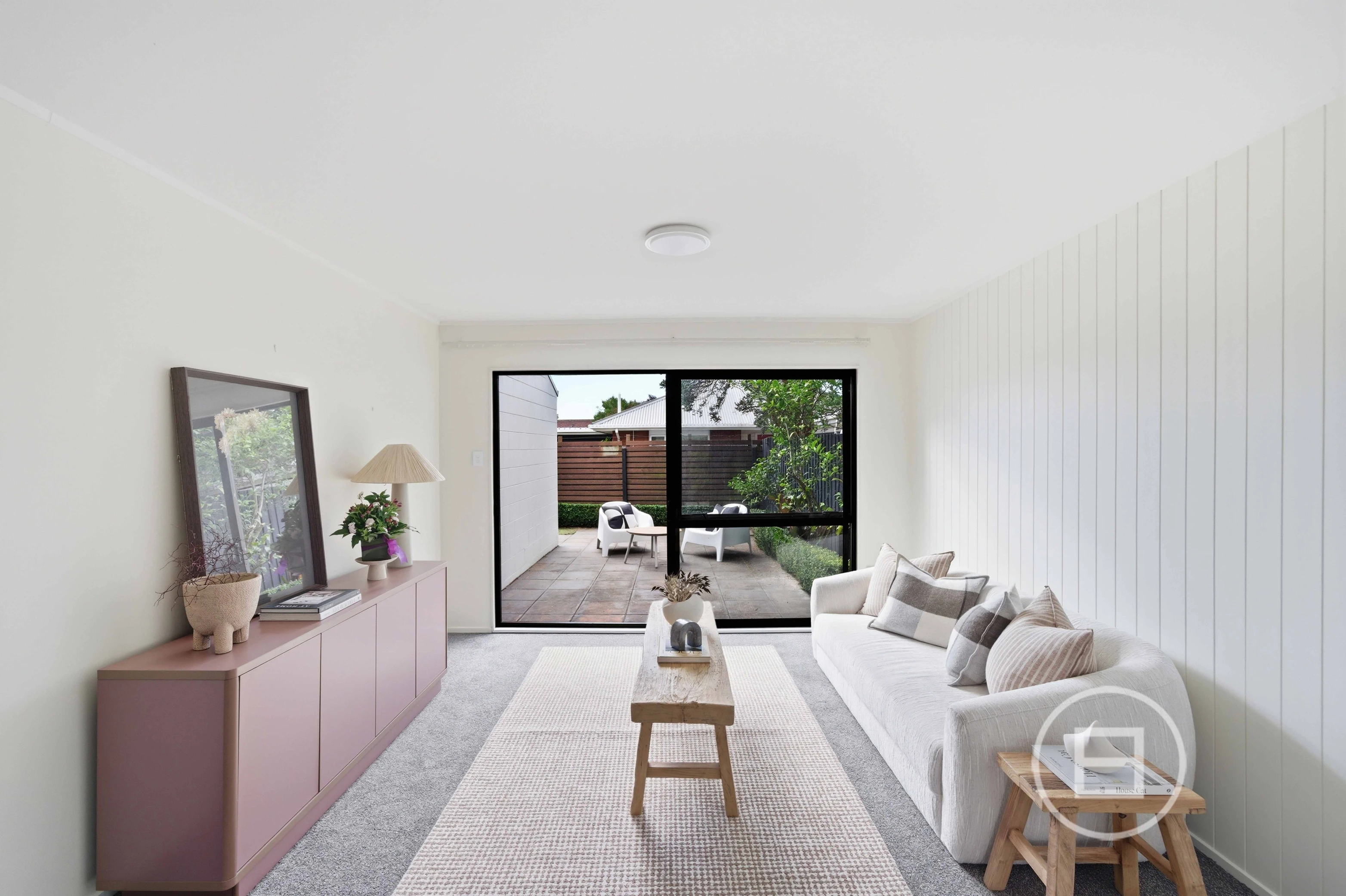 The lounge and living areas feel relaxed and welcoming, naturally extending to the outdoors. Sliding doors open onto the courtyard, a private, landscaped sanctuary perfect for entertaining or enjoying quiet moments. Afternoon sun floods the space, spilling warmth throughout the home and creating a calm, grounded atmosphere.